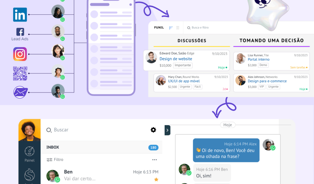 - Integração com canais de comunicação: WhatsApp, Instagram, e-mail, Messenger e mais.
